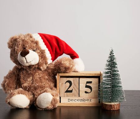 December 25 Christmas wooden calendar with teddy bear wearing Santa hat