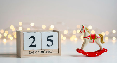 December 25th on a wooden calendar block. Christmas holiday with a toy rocking horse on a festive background.