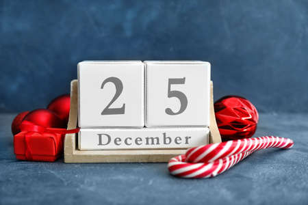 Calendar with date of Christmas and decorations on gray background
