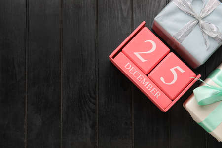 Wooden block calendar with 25 december date, Christmas decorations, red cup of tea and gift boxes on black background with sparkles. Selective focus