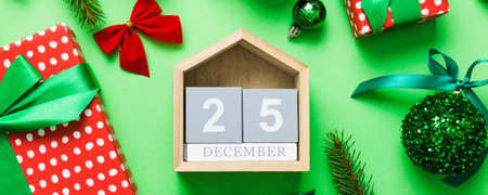 December 25th. Christmas composition on colored background with a wooden calendar, with a gift box, toys, bauble copy space.