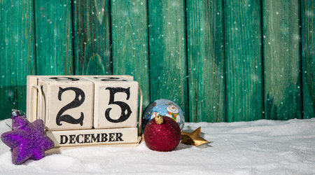 25 December Christmas theme on snow with green wooden background.