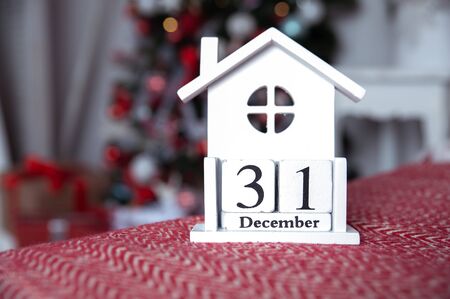Wooden calendar with on the background of a Christmas tree with a date of December 31, a symbol of the new year