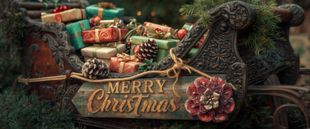 Elaborate antique-style sleigh filled with colorful gift boxes, pinecones, and evergreen branches. Perfect for holiday marketing, Christmas campaigns, and seasonal advertising materials.