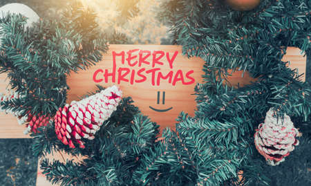 Merry Christmas text.. Merry Christmas background with xmas tree and wood table.