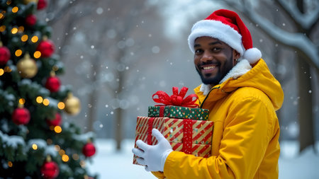 Joyful African man in Christmas sweater and Santa hat smiling against a festive background with Christmas tree lights, capturing the spirit of the holiday season