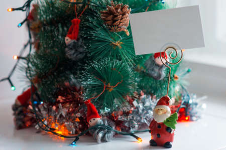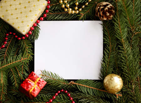 White blank sheet around branch of a Christmas tree and New Years decorations. Congratulations for the New Year and Christmas concept