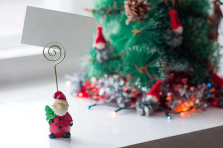 Santa Claus figurine on the background of the Christmas tree with copy space card