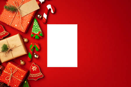 Blank sheet of paper with Christmas gift and gingerbread cookies on red background