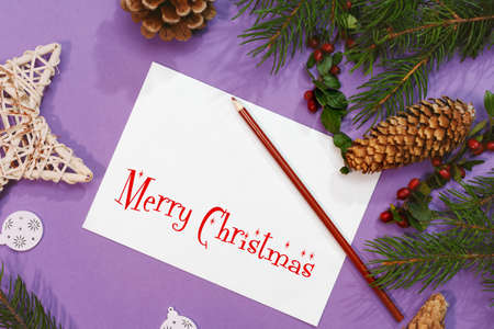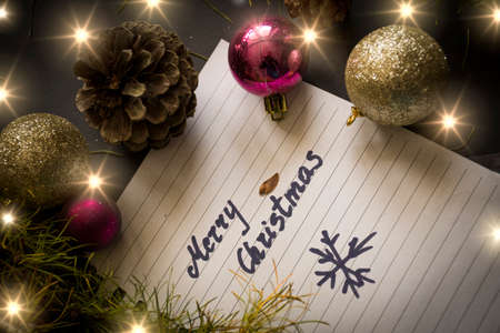 Festive design of Christmas greetings. Golden and pink baubles, natural pine cone and a branch of larch. The text in English is Merry Christmas is written on lined paper. Selective focus on the text