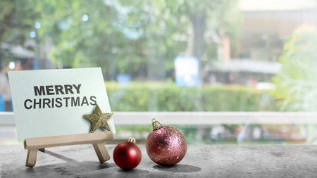 Inscription Merry Christmas outlined on red and green background with copy space. Selective focus on Lettering Merry Christmas next to Christmas ball. Celebration concept.