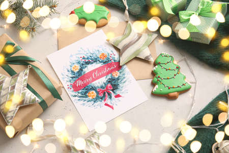 Christmas greeting card template. Empty paper mock up. New year flat lay, top view, copy space
