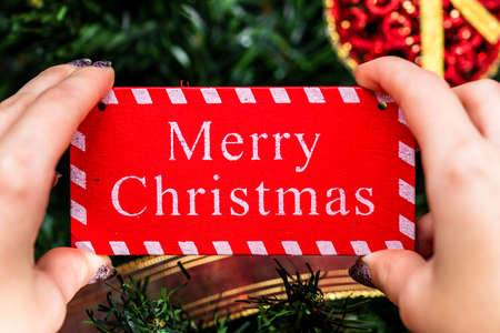 Christmas card in front of decorated tree with festive holiday greeting in women's hands. concept of christmas celebration, holiday spirit, festive greeting card.