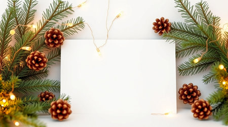 Christmas greeting card mockup with fir tree branches, pine cones and garland lights on white background