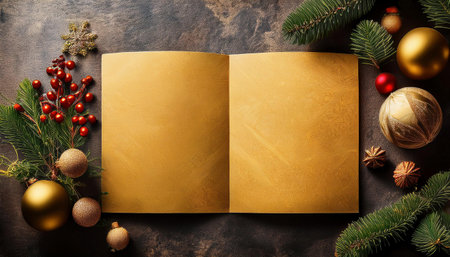 A top-down shot of a Christmas flat lay featuring gift boxes, fir branches, and shiny balls, with plenty of room for your own holiday message.