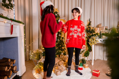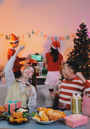 Happy young Asian couple women enjoying Christmas party in home