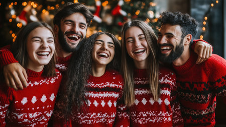 Diverse group of friends laughing together in matching red Christmas sweaters