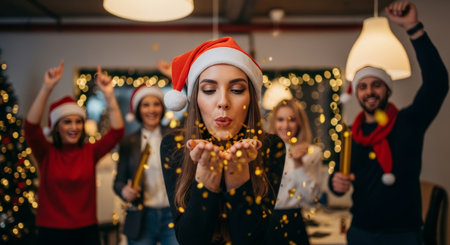 Festive image of a woman blowing confetti at a Christmas party, perfect for holiday-themed advertising, editorial content, and social media promotions.