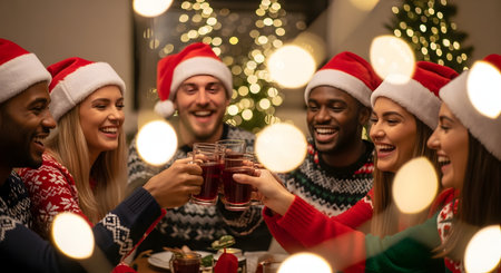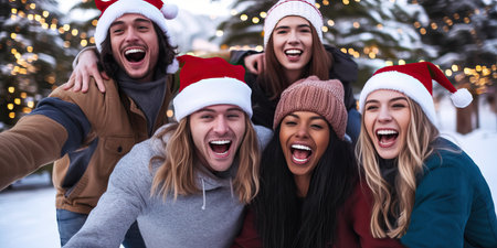 Group of diverse young adults wearing Santa hats taking selfie with warm bokeh lights and Christmas decor. Perfect for holiday marketing, social media campaigns, and seasonal advertising.