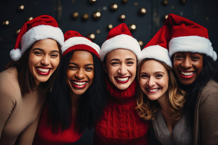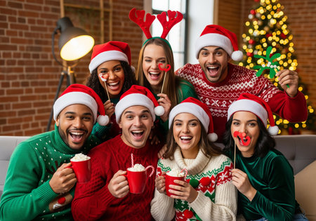 A joyful and diverse group of friends smiles together in a cozy indoor setting decorated for the holiday season, capturing the essence of friendship and celebration.