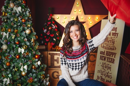 Smiling beautiful woman dancing around a decorated Christmas tree, before New Year eve at home, Christmas holiday celebration