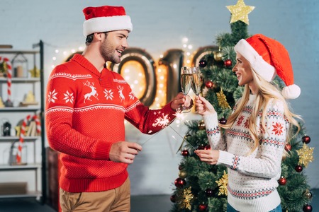 Happy couple in santa hats holding sparklers and clinking with champagne glasses on christmas eve