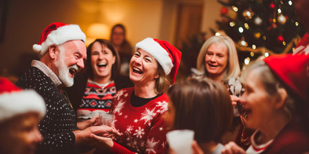 Holiday Cheer. Friends enjoying festive drinks and snacks in a cozy kitchen.