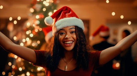 Head shot portrait overjoyed African American woman laughing, looking at camera, posing on Christmas tree background at home, blogger shooting vlog, having fun, using webcam, making video call. High quality photo