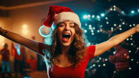 A cheerful woman in a festive red outfit and Santa hat blows a flurry of artificial snowflakes into the air, creating a magical winter scene. Behind her, a beautifully decorated Christmas tree adorned with shimmering ornaments adds to the enchanting holiday atmosphere.