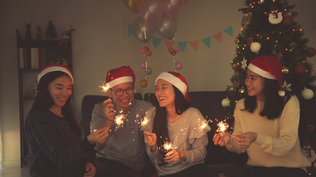 Group of asian young people celebrating Christmas party by sparkle firework