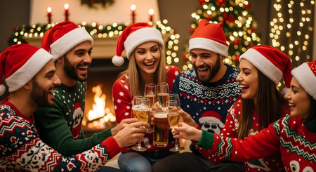 Friends young people are gathering for Christmas and New Year holiday, spending quality time together, drinking champagne, smiling at each other, and celebrating the happiness festival