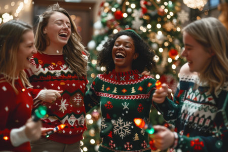 A lively scene of a group of friends in ugly Christmas sweaters dancing joyfully around a beautifully Christmas tree, celebrating the holiday spirit