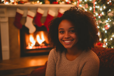 Merry Christmas and Happy Holidays! Woman in cozy living room with fireplace.