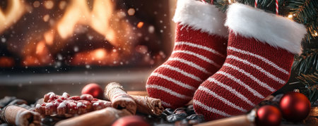 A cozy Christmas scene featuring knitted stockings hung by a fireplace, decorated with ornaments and a gift box, with a festive mug of hot chocolate
