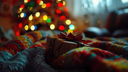Warm blankets and gift boxes with a bow. Blurred background of Christmas tree. New Year mood in a living room.