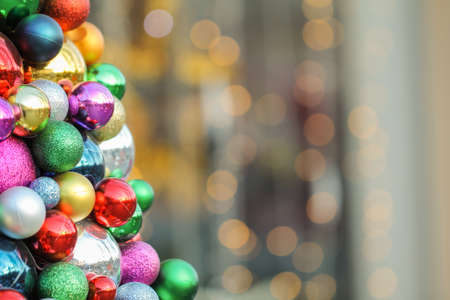 Close-up of the beautiful multicolored christmas balls hanging on the fur-tree and Christmas lights. Colorful decoration of Christmas tree
