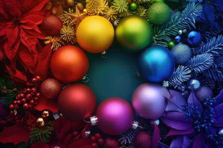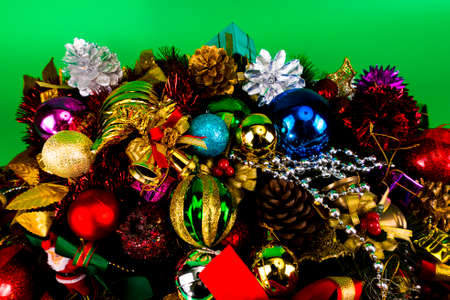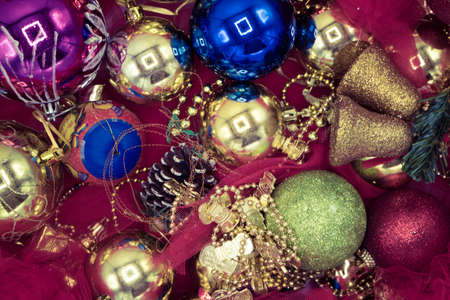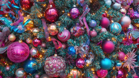 Christmas vibrant colorful wallpaper background texture of balls and decorations for the celebration tree.