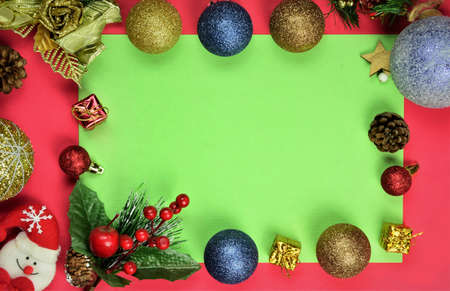 Merry Christmas. Two-color background with a variety of Christmas decorations. Space in the center for text or idea.