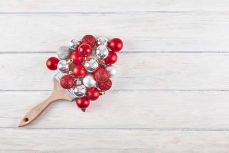 Christmas colorful collection, balls and decorative ornaments, on white wooden background.