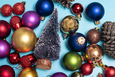 Christmas flat lay with colorful Christmas balls, little Christmas tree and a pine cone on blue background