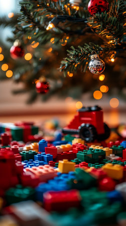 New Year's toys are scattered on the floor, decorations for the new year. Christmas background.