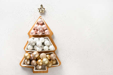 Christmas greeting card with plate fir tree shaped with golden shiny baubles on white background. Copy space. Top view. Alternative Creative Xmas tree.