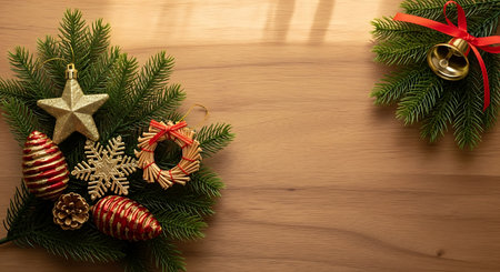 A close-up view showcases vibrant Christmas ornaments, including pinecones, baubles, and a star, arranged on a fir branch against a warm, textured wooden surface.