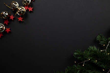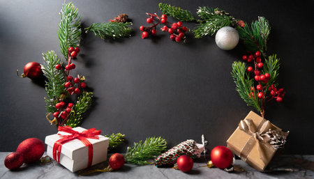 Christmas decorations and fir tree branch and gift boxon dark table. Top view frame with copy space.