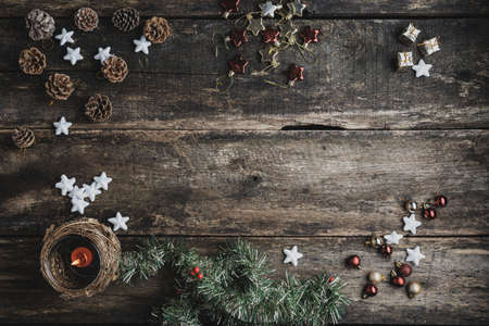 Top view of rustic wooden desk with holiday decorations, ornaments and candle placed on it forming a frame for an empty middle ready for your message or product.