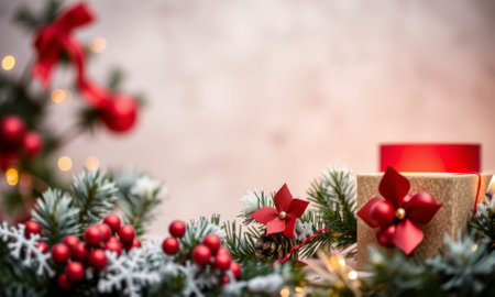 Christmas light background, fir branches with red baubles, pine cones and berries in the corner, beautiful frame and copy space for your text. White creative layout, flat lay, top view.