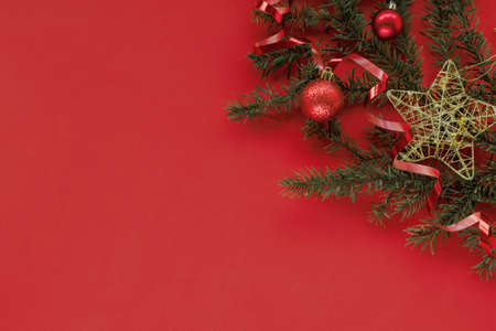 Christmas decorations on red background. Fir twid, star and baubles. Top view, flat lay, copy space.