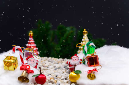 Close up decoration santa claus dolls and christmas gifts isolated on bokeh background