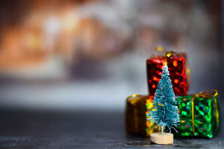 decorative Christmas trees decorated and gifts for the new year on the bokeh background, new year mood 2021
