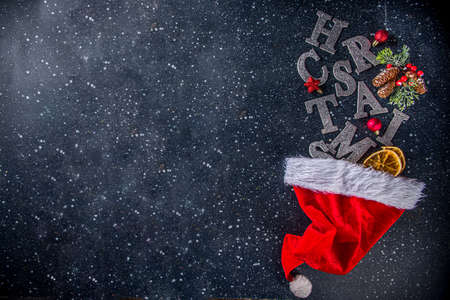Christmas holiday card background. Santa hat with Christmas and New Year decor, flat lei on a dark blue background, top view